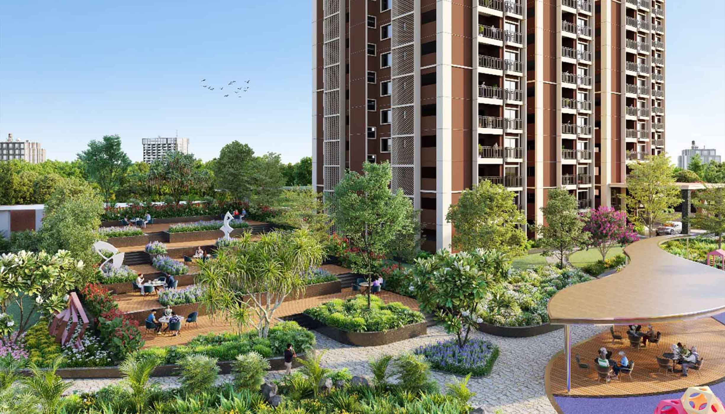 The project features two exclusive clubhouses with resort-style facilities, including swimming pools and dedicated spaces for indoor and outdoor sports. Residents can enjoy cricket practice areas, jogging tracks, basketball, tennis, badminton, and squash courts, all set amid lush landscaped greenery.
